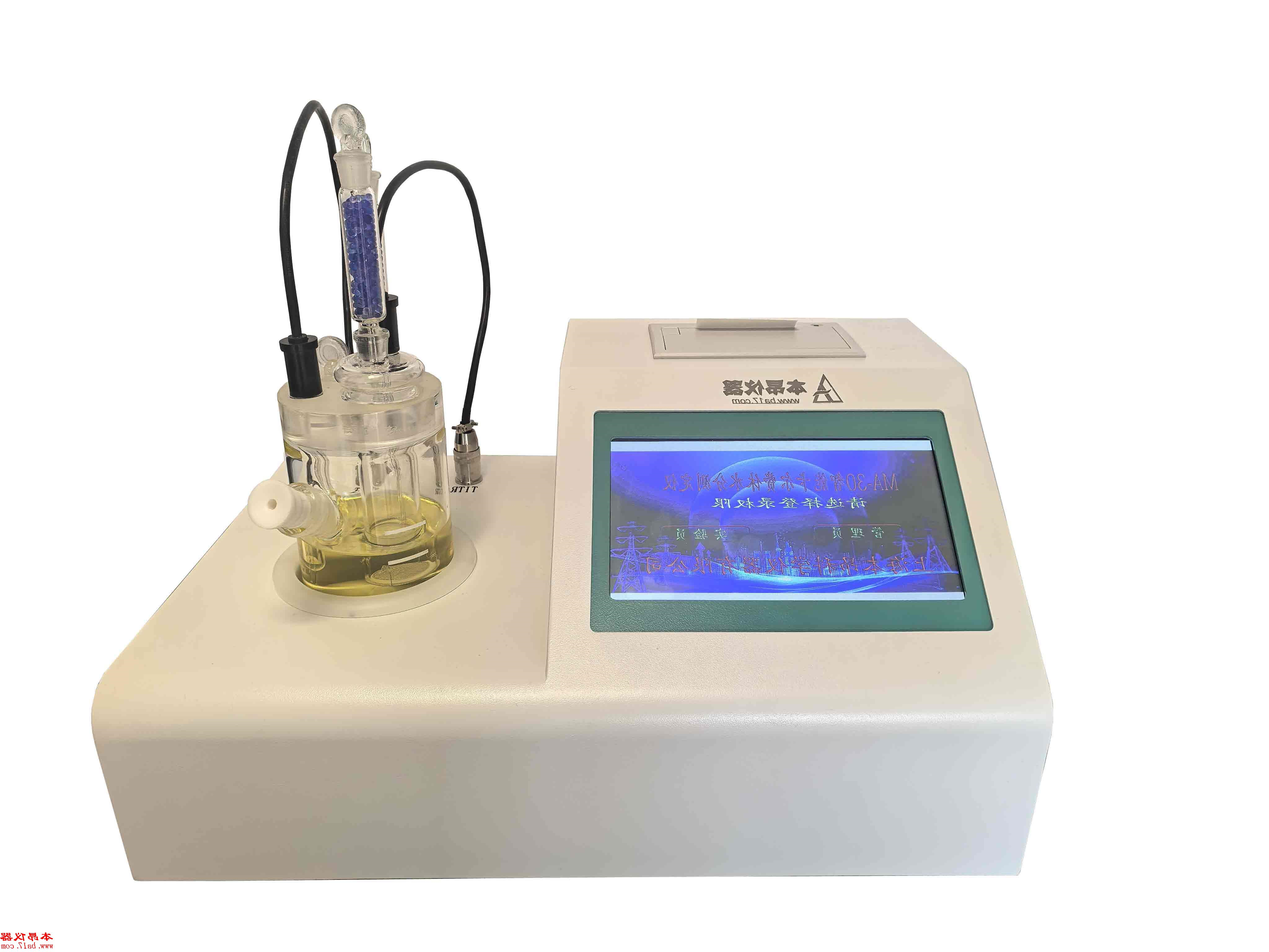 MA-30智能卡尔费休水分测定仪详细介绍: MA-30智能卡尔费休水分测定仪是在MA-3智能卡尔费休水分测定仪的基础上升级而成, 新增自动扣除空白水分的功能,是配套国内外各款卡尔费休干燥炉(卡氏炉)的首选; 𓂃新增校准程序,通过标准样校准,可软件微调系统增益系数,修正到无穷接近于绝对准确值,水分测量精度真正达到0.001ppm; 新增样品测定曲线,可及时判断是否有副反应发生,样品测试过程更加直观; 新增管理权限功能; 新增水分测定速度自动调节功能。 ♏采用LCD大屏幕触摸显示器,软件界面内容丰富,操作内容汉字提示,人机对话灵活、方便,除具有检测灵敏阈高、操作简单、测试速度快、重复性好等特点外,还具有根据国际标准文献设有吸水度测定的功能;试验结果存储、打印功能;样品测定过程由仪器自动控制,搅拌、测定60秒左右自动完成,直接显示测定结果;全密封滴定池瓶,避免试剂与人接触,也避免环境湿度的影响;仪器应具有中文液晶显示,并具有自动计算和打印功能,能打印出百分含量、样品编号、试验员、实验日期等内容。 ᩚᩚᩚᩚᩚᩚᩚᩚᩚ𒀱ᩚᩚᩚMA-30智能卡尔费休水分测定仪采用带触摸屏的超大屏幕LCD液晶显示器、智能操作系统,人机对话灵活方便,会电脑的基本操作即可轻易上手。 MA-30智能卡尔费休水分测定仪技术参数: 自动吸入试剂 自动排废液 试剂失效自动提醒 水分测定速度自动调节 显示方式:LCD触摸大屏幕显示器 测量范围:1μg-500mg, 0.1ppm至100% 分辨率:0.001μg,0.1ppm 准 确 度:2μg-500μg ± 1 μg 500μg以上为0.1%(不含进样误差) 重复性:0.0002 水份滴定的线性相关系数:≥0.9998 使用电源:交流220V±10%,50Hz 功率消耗:小于50W 使用环境温度:5℃-40℃ 使用环境湿度:85%